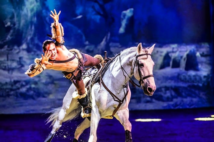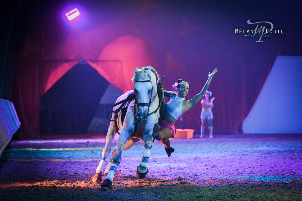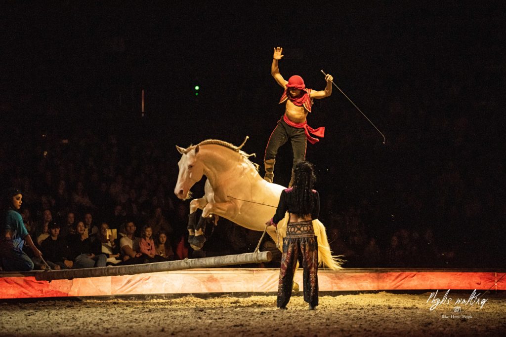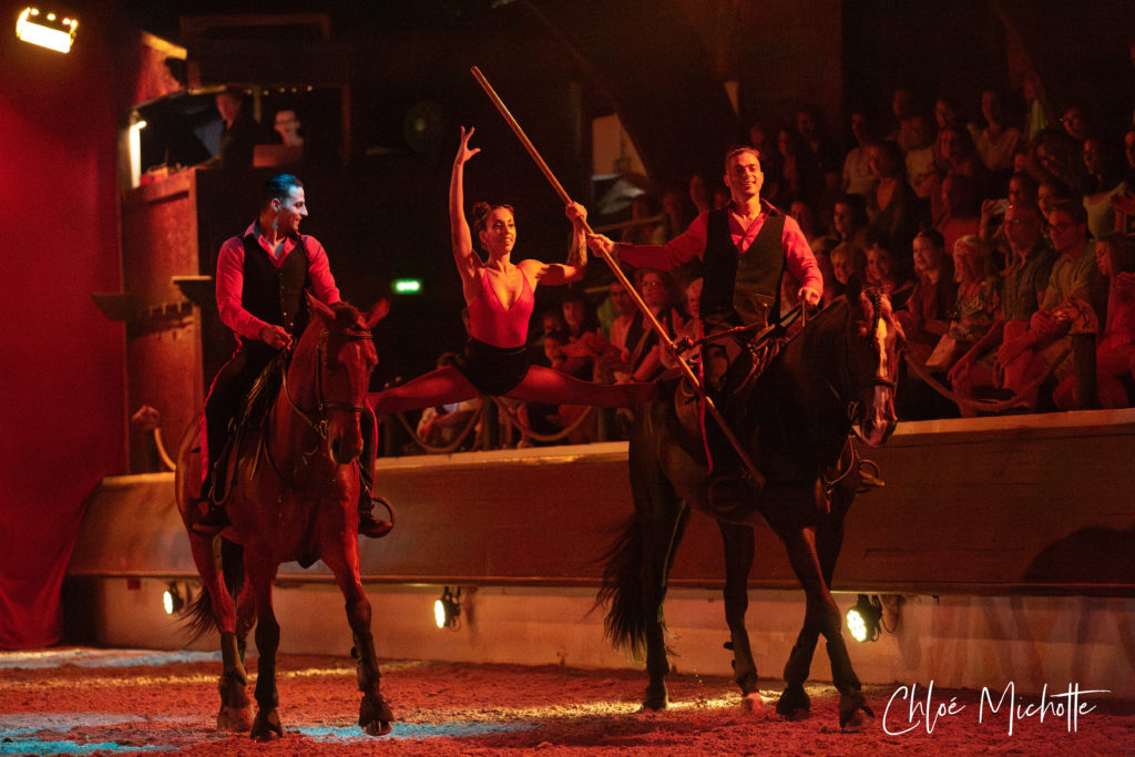 Debout sur la croupe d’un cheval lancé au galop, les artistes enchaînent figures spectaculaires, portés, sauts et équilibres, dans une chorégraphie en mouvement constant.
